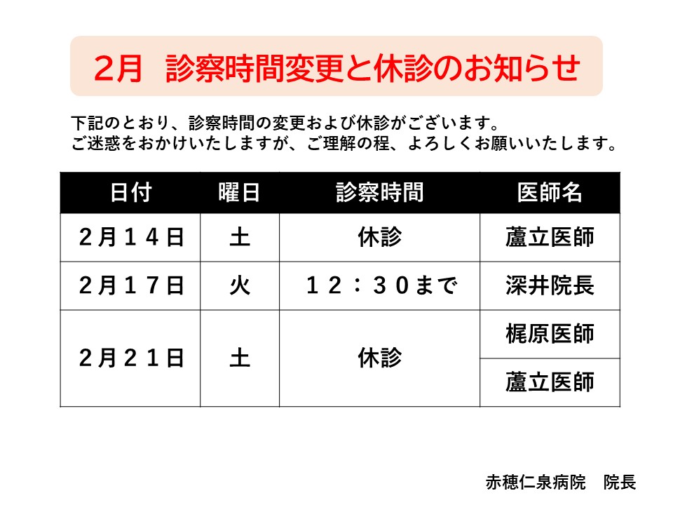 2月 休診及び診察時間の変更について